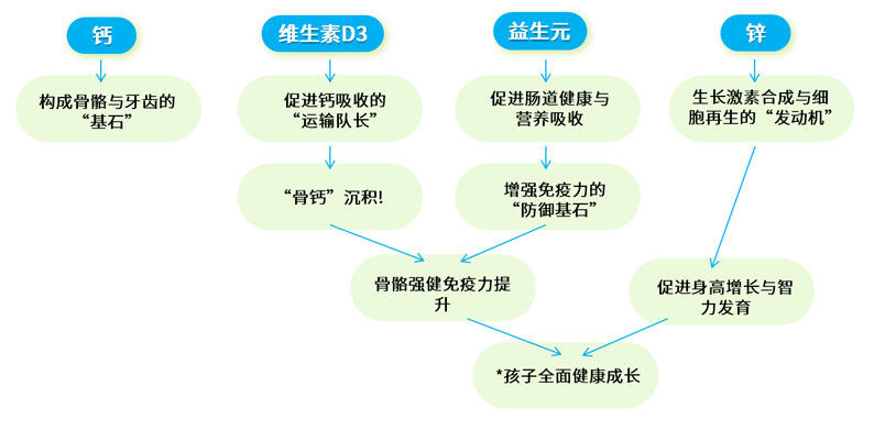 这个组合(柠檬酸钙 + VD3 + 益生元 + 柠檬酸锌)是一个经过精心设计的、高端且高效的成长