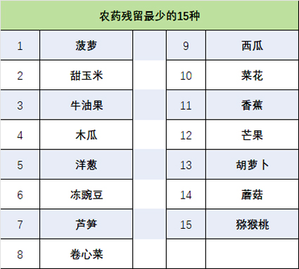 在农药残留最少的15种水果蔬菜中,近60%的样本未检测到农药残留,只有