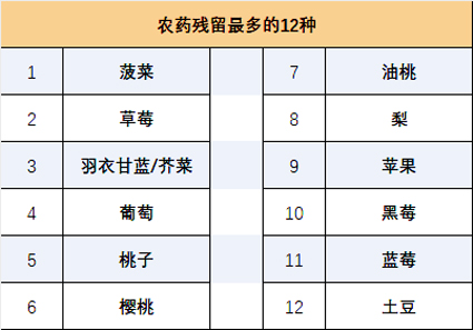 在12种农药残留最多的水果蔬菜中,超过95%的样本含有农药残留,共发现